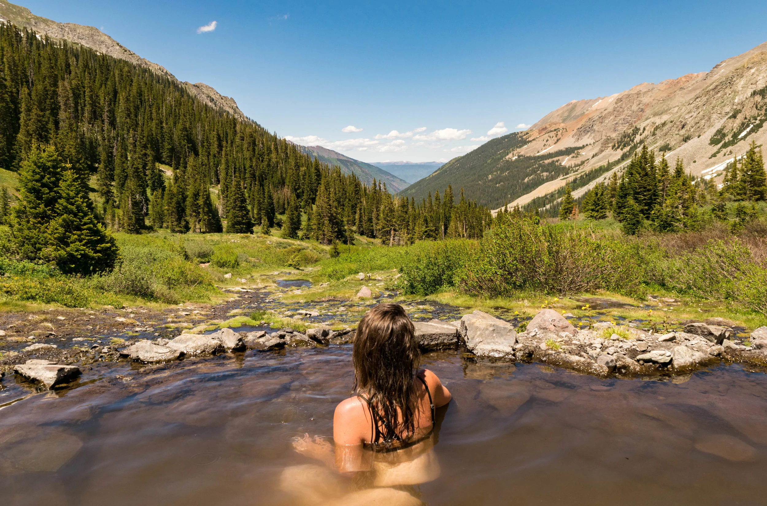 About 4 hours from Denver in the Maroon Bells-Snowmass wilderness sits the highest hot springs in North America. The 8.5 mile trail gaining 3,000 ft. in elevation is well worth the effort to one of Colorado’s most spectacular settings. The isolated hot springs consist of several pools varying in size and temperature. The larger pools are about 3 feet deep and were 100 degrees when we visited in mid-June!