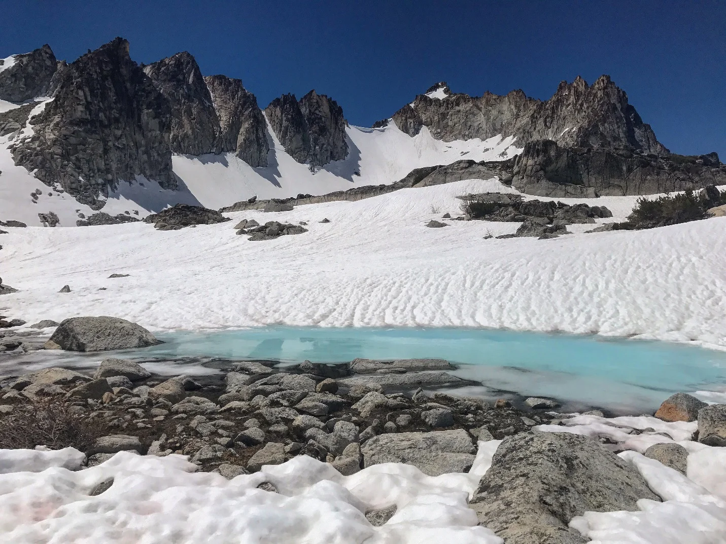 Day Three: Our trek up Aasgard started at 8 AM by scrambling across a boulder field prior to crossing the stream of melting water. As you climb be sure to pause and take photos as you go up, the views are spectacular. After you cross the creek, the route will continue to steepen becoming a bear crawl up loose rock and gravel among the larches. As you enter the false summit, you will rest your eyes on the final jaunt to the top; which seems easy after you tackled the first portion. However, you will have to traverse across a snow field which has melting snow underneath you. We had to be cautious for our team and remain on the foot path created from the backpackers traveling ahead of us. Once you climb the final boulder field you reach the top of Aasgard at 7,800 feet, entering the Upper Enchantments. At 11 AM we arrived at the top of the summit, feeling as if we stepped into another world. We rested up here for lunch and filtered the stream water at the summit. By far the best water source in the Core!
